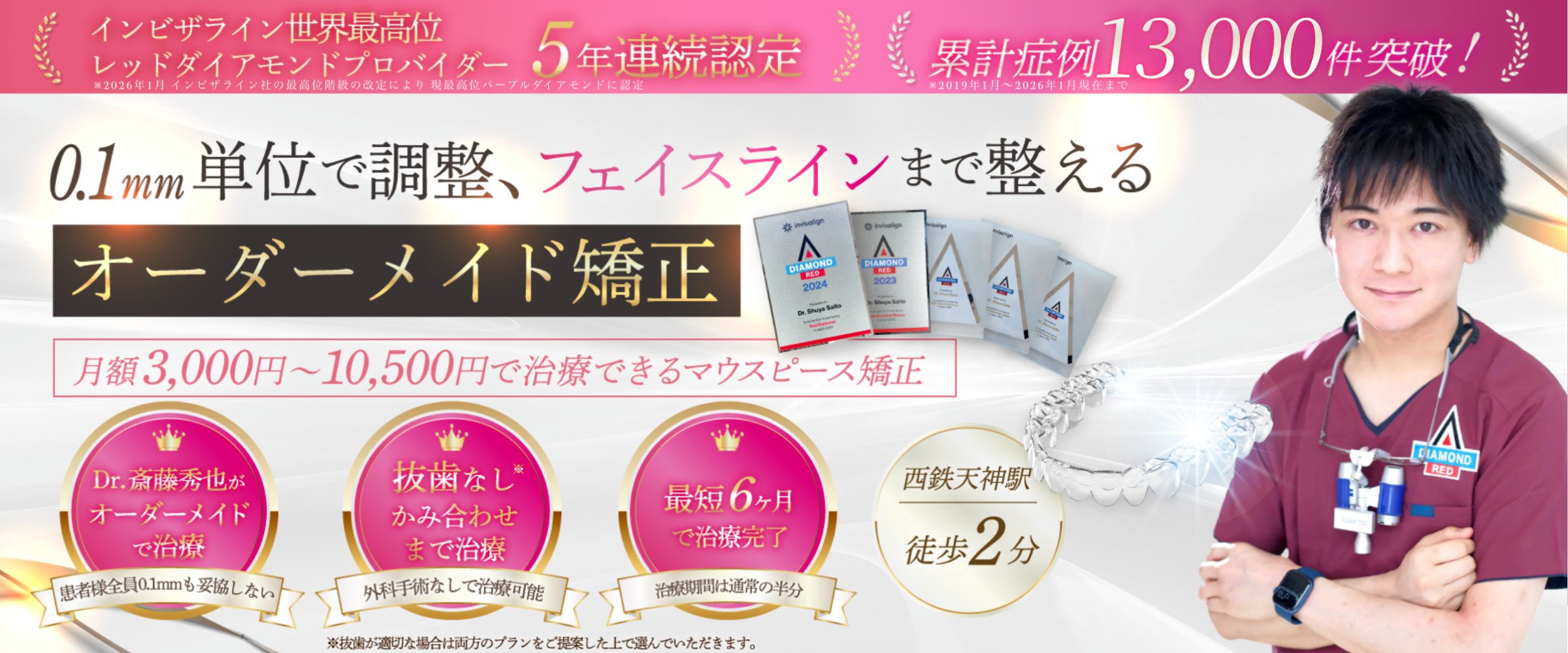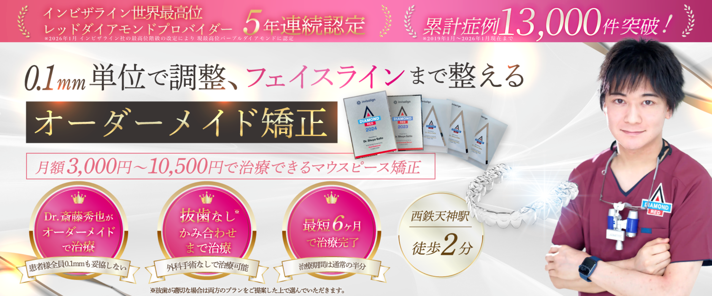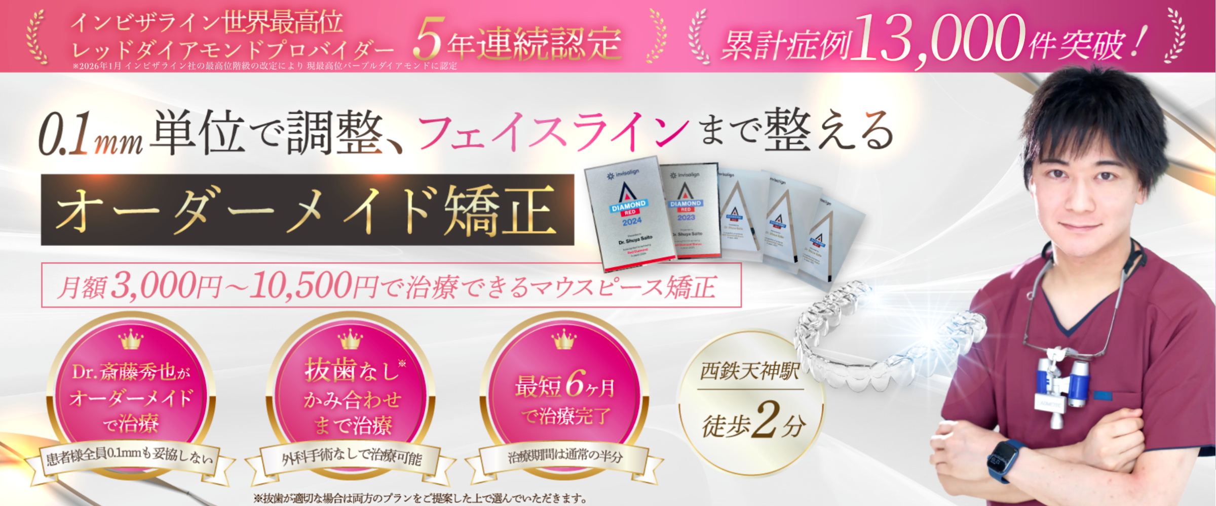 彼は2019~2023年の4年間、インビザラインにおいて北海道で最多の症例数を手がけました。さらに日本で約5人ほどしかおらず、北海道では初となるレッドダイヤモンドプロバイダーの認定も受けた人物です。※2026年現在、レッドダイヤモンドの上位パープルダイヤモンドが新設され、現在はパープルダイヤモンドプロバイダーの座に就いております