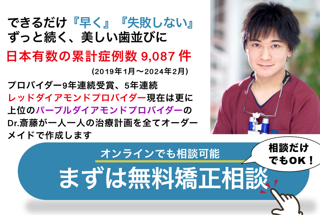 お子さまの歯列矯正も、ワイヤーではなくマウスピース矯正(インビザライン)で対応可能です。お子さまに従来のワイヤー矯正治療は歯の根が短くなる危険性がありますが、さいとう矯正歯科のマウスピース矯正では、そのリスクを限りなく低減できます。さいとう矯正歯科で治療されるお子さまのほとんどが、他の矯正歯科さんで「ワイヤー矯正ではないと治療できない」と言われた方ですが、今までさいとう矯正歯科ではすべての患者様をマウスピース矯正で治療しております。